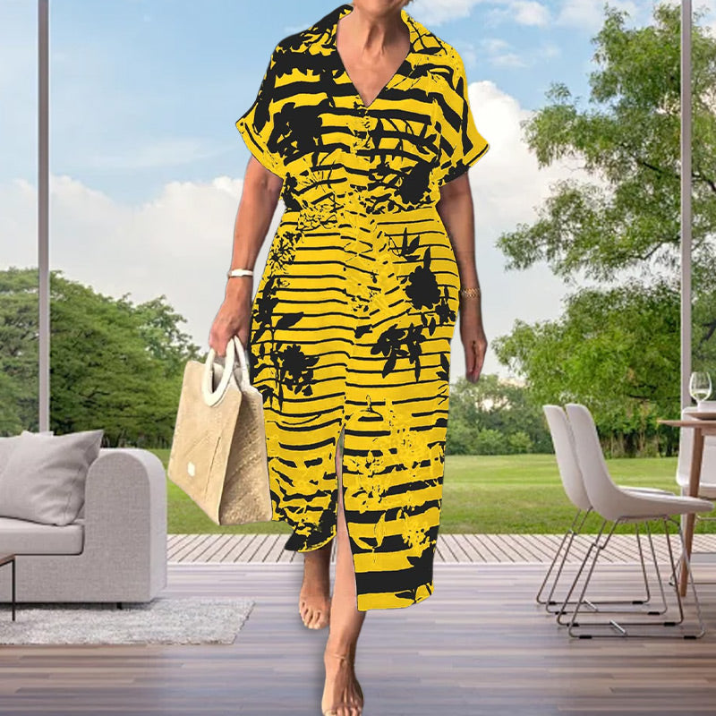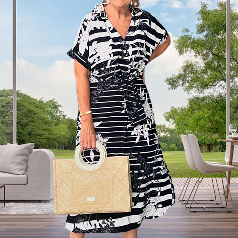 ЦВЕТЕН МОДЕЛ С РЪЧКИ: тази рокля съчетава цветен десен с райета, като перфектно пресъздава същността на лятото. Флоралният десен подчертава елегантността ви, а райетата добавят модерен щрих, за да ви накарат да изпъкнете при всеки повод.