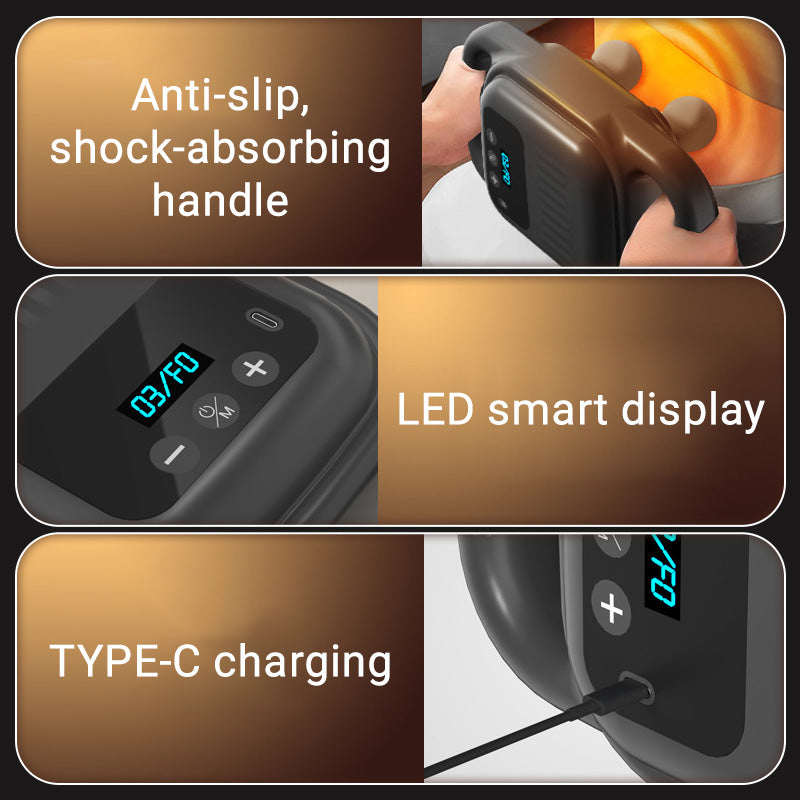 МОЩЕН ДИЗАЙН НА ЧЕТИРИТЕ ГЛАВИ: Той се отличава с мощен дизайн на четирите глави, който позволява релаксация на голяма площ. Този ефикасен дизайн осигурява по-ефективно облекчаване на мускулите, като покрива по-голяма площ с всеки удар, което значително подобрява релаксацията и възстановяването.
