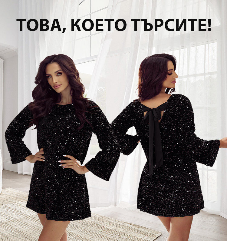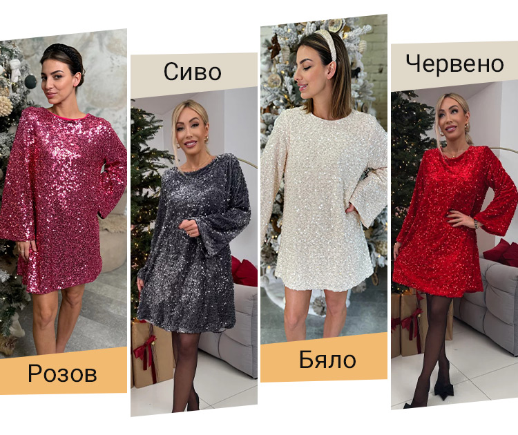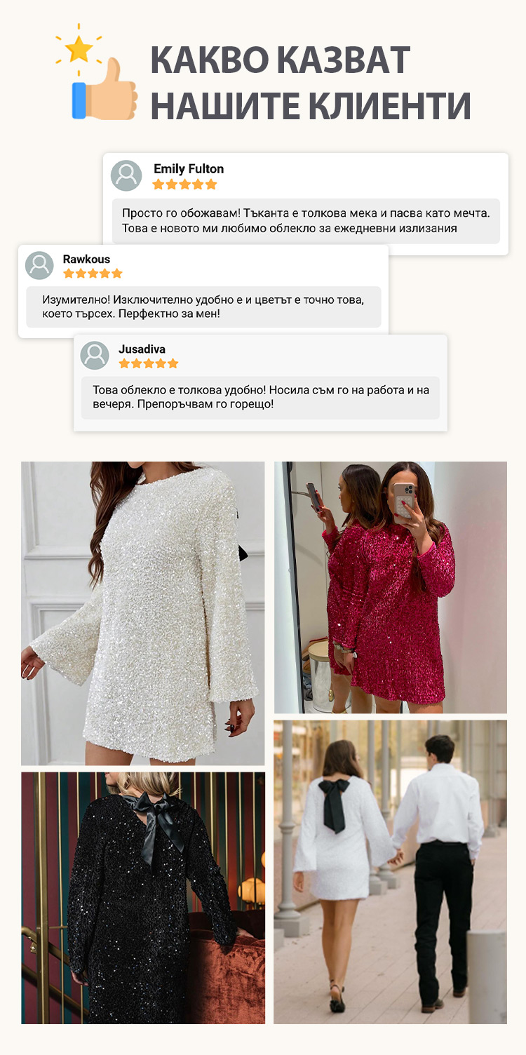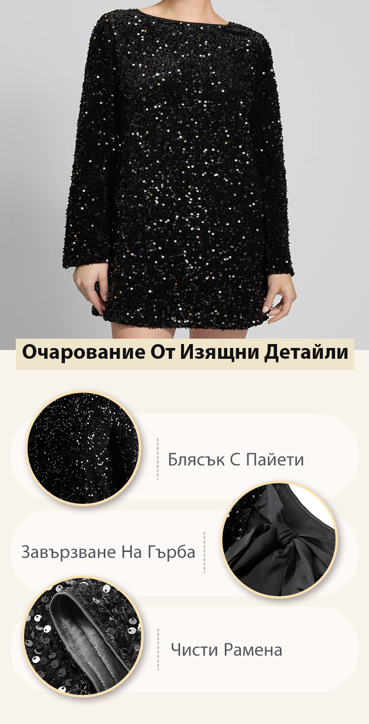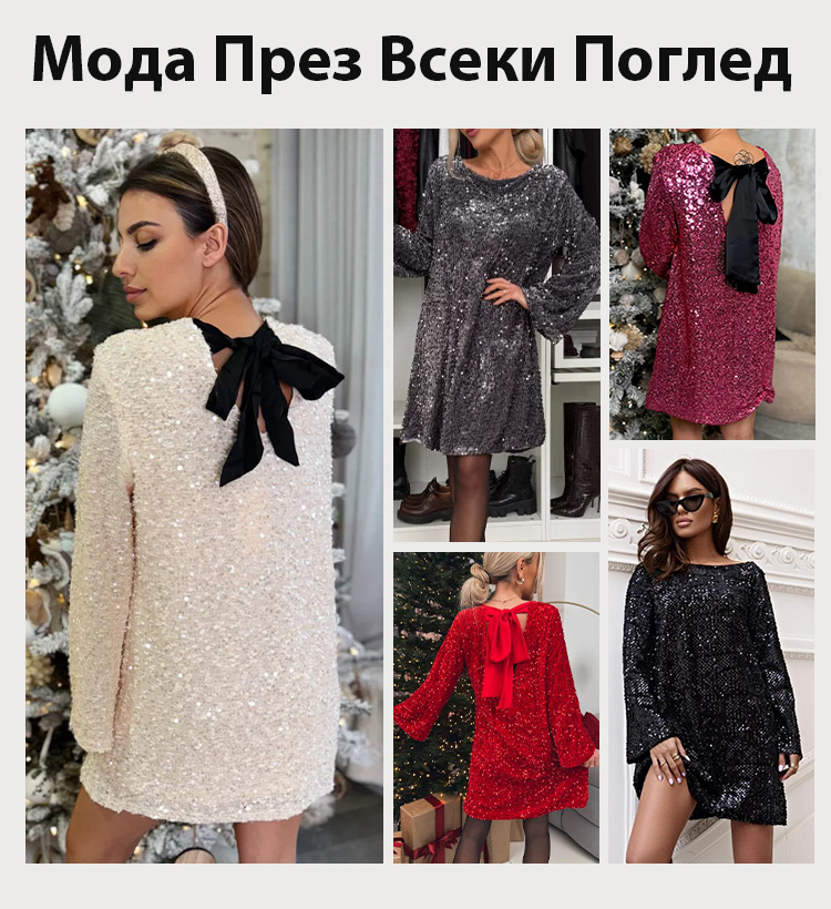 Свободна рокля с дълъг ръкав с пайети и вратовръзка