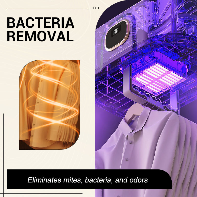 Ефективност на дезинфекцията- Не само сушене, но и гарантиране на чистота. Горещият въздух ефективно елиминира бактериите и праховите акари, а вградената технология с отрицателни йони неутрализира миризмите. Гарантира, че дрехите не само са сухи, но и хигиенично безопасни и освежаващо свежи.