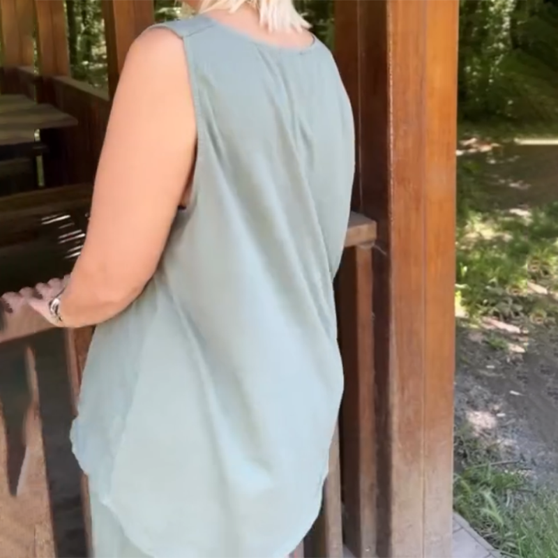 V-образно деколте и горнище без ръкави – горнището без ръкави има ласкателен V-образен дизайн, който осигурява открито и просторно деколте. Изчистените му, семпли линии осигуряват свобода на движенията в областта на раменете и врата, без да увеличават обема. Този дизайн спомага за проветряването и се съчетава безпроблемно с подходящите къси панталони, за да завърши визията.