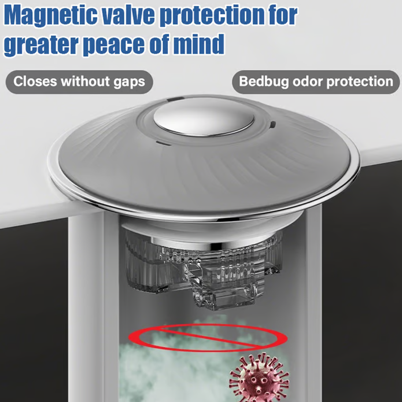 АНТИ-МИРИЗМА И БЛОКИРАНЕ НА НАСЕКОМИ: Вграденият магнитен всмукателен клапан създава безпроблемно и здраво затваряне, което ефективно блокира неприятните миризми и досадните насекоми, помагайки да поддържате банята си по-чиста, по-свежа и много по-хигиенична за ежедневието.