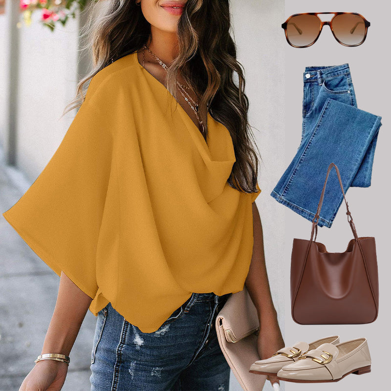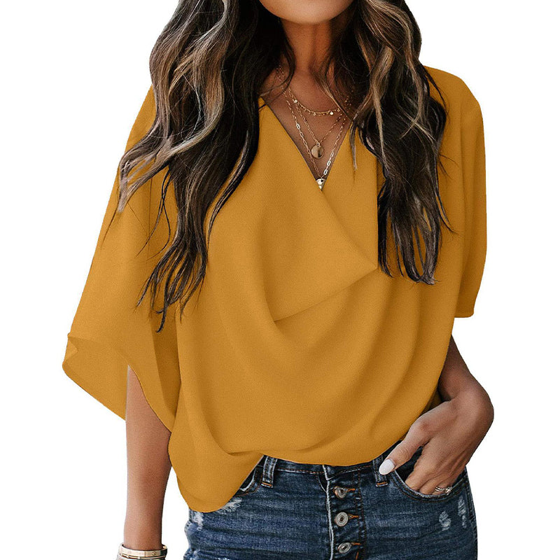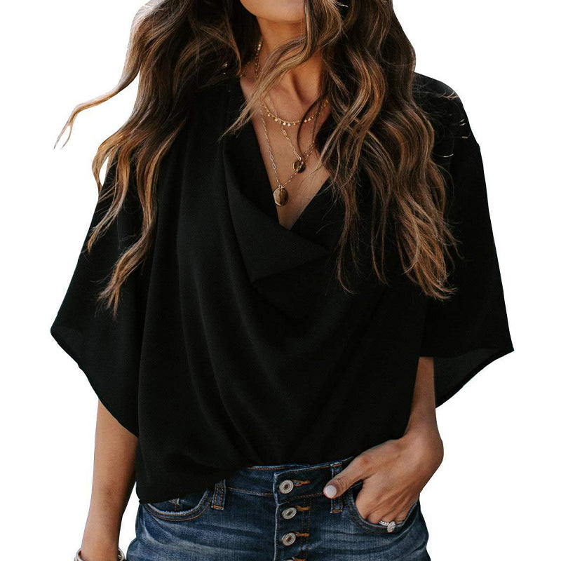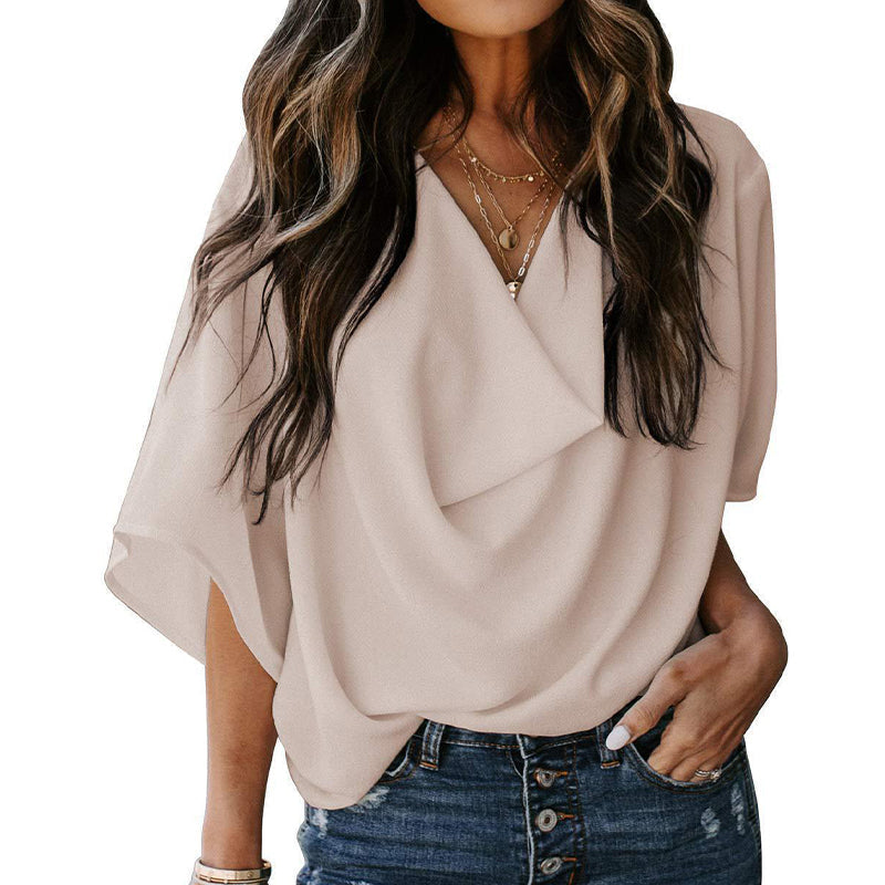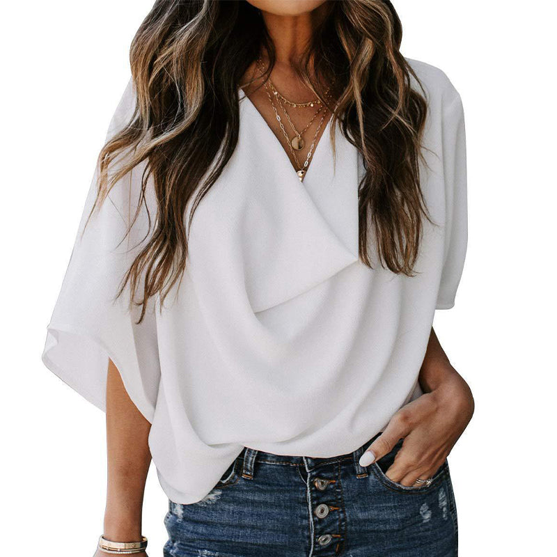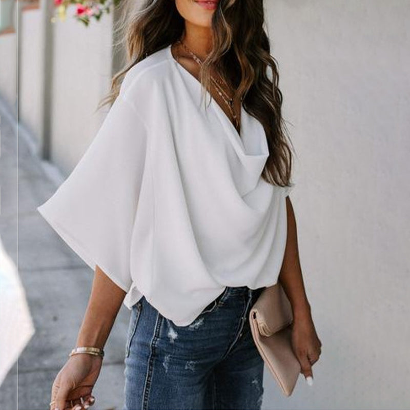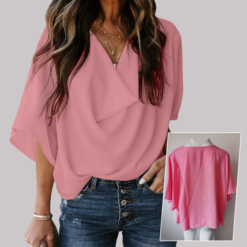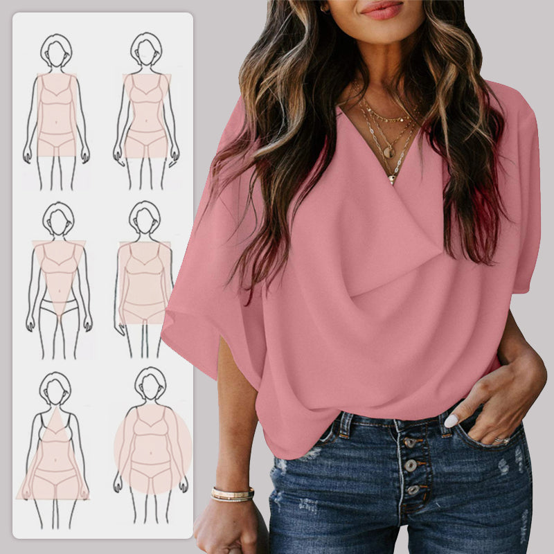 НЕРЕГУЛЯРНО V-ОБРАЗНО ДЕКОЛТЕ ЗА УНИВЕРСАЛНА ПРИВЛЕКАТЕЛНОСТ - Внимателно подреденото под ъгъл деколте създава удължаващ ефект, като същевременно осигурява скромно покритие. Този непреходен дизайнерски елемент допълва всички форми на лицето и се съчетава чудесно с многопластови колиета или висулки за индивидуален стил.