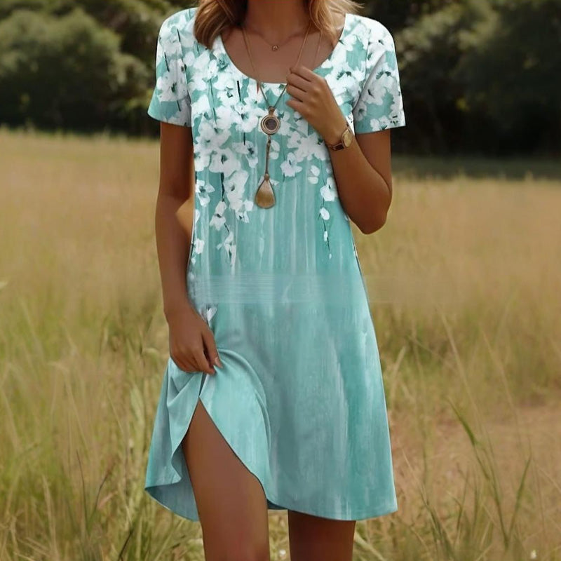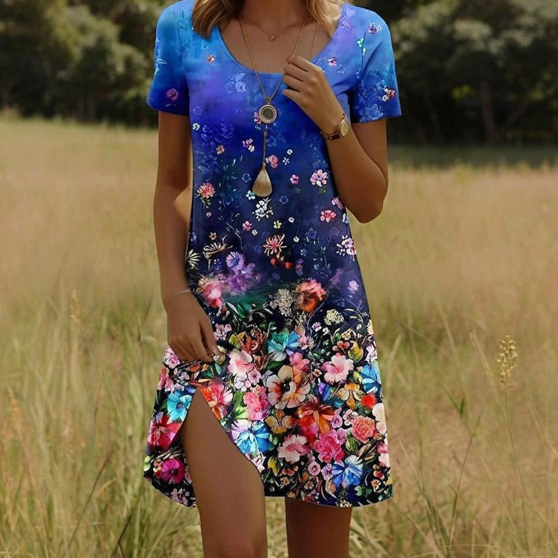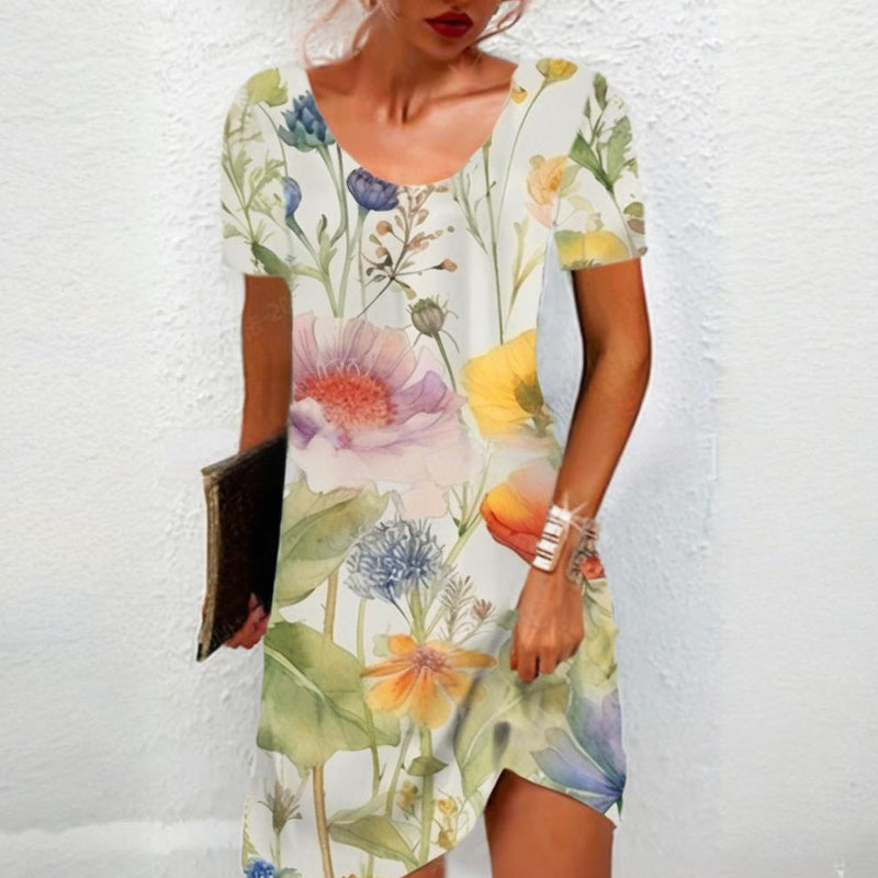 КРАСОТАТА НА ПРИРОДАТА ВЪВ ВСЕКИ ШЕВ - Позволете на тази рокля да бъде вашето платно - живи цветя разцъфват по плата като градина, огряна от слънцето. Всяко деликатно листенце и влачеща се лоза нашепват за лятна романтика без усилие, идеална за пикник или коктейл по залез слънце.